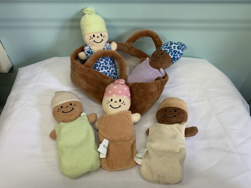 Includes: 1 basket, 5 plush baby dolls